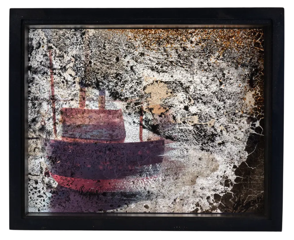 Boat, Iron Byproduct, Carbon, Sumi Ink and Gesso on Photo Paper, 9 x 11 x 2 inch, 2024