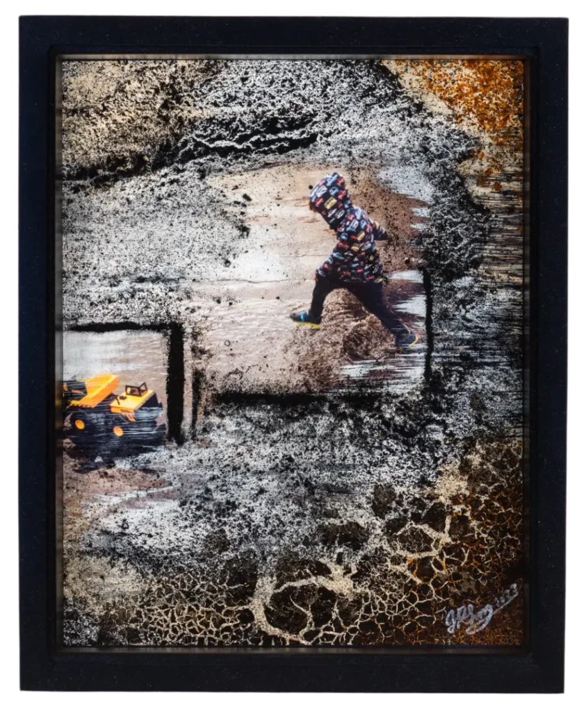 Ubahn in color, Iron Byproduct, Carbon, Sumi Ink and Gesso on Photo Paper, 11 x 9 x 2 inch, 2022