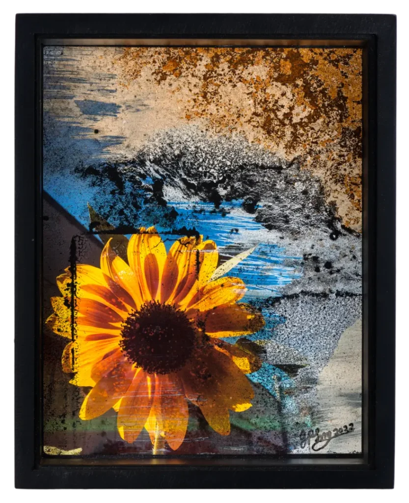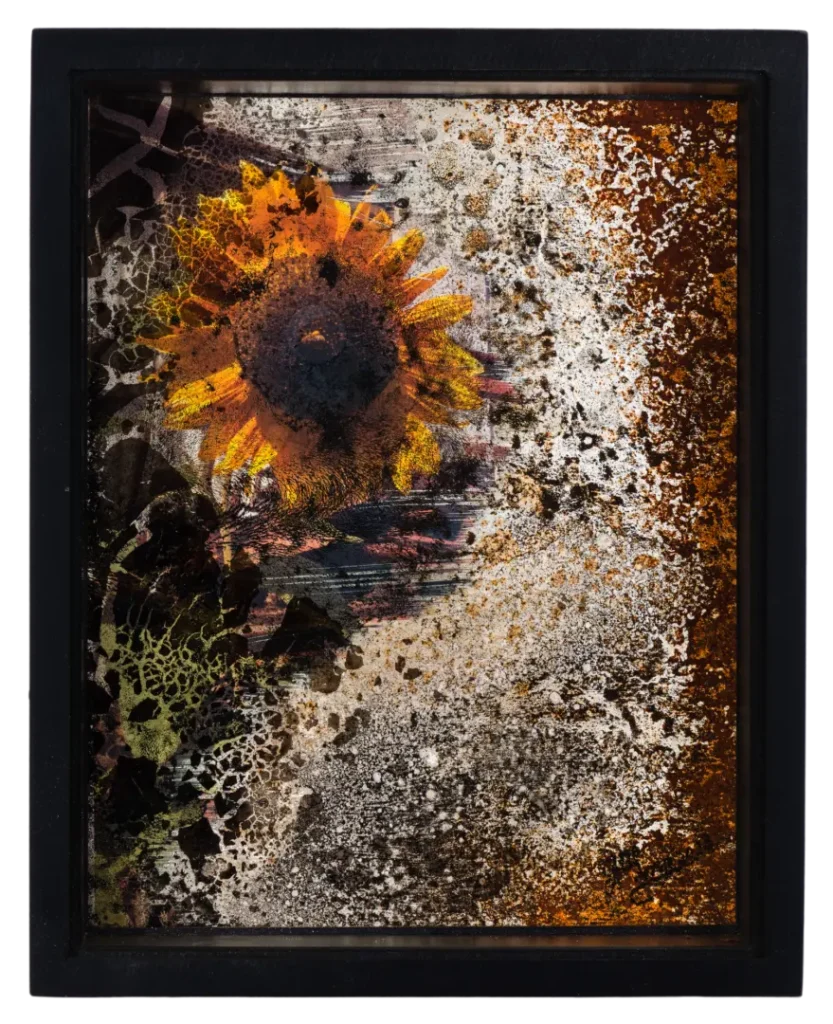 Sun Flower, Iron Byproduct, Carbon, Sumi Ink and Gesso on Photo Paper, 11 x 9 x 2 inch, 2022