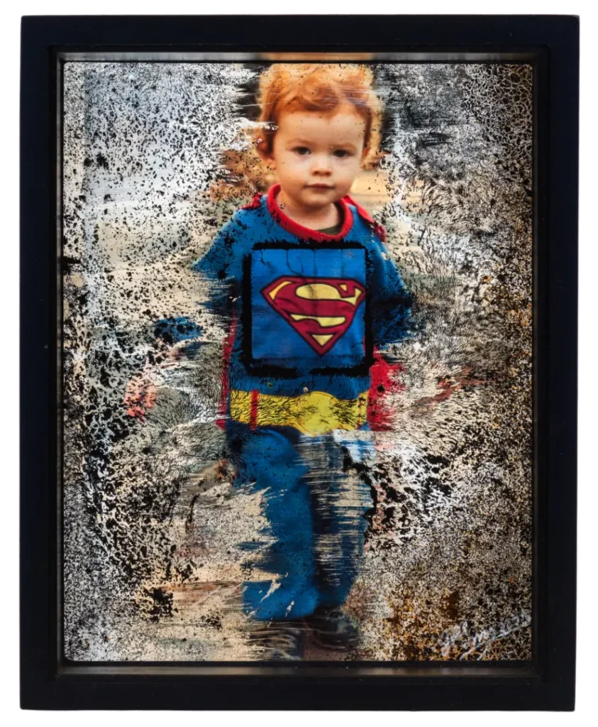 Superman in color, Iron Byproduct, Carbon, Sumi Ink and Gesso on Photo Paper, 11 x 9 x 2 inch, 2022