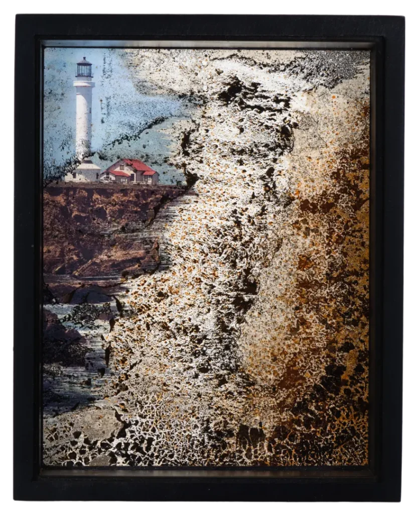 Lighthouse, Iron Byproduct, Carbon, Sumi Ink and Gesso on Photo Paper, 11 x 9 x 2 inch, 2023