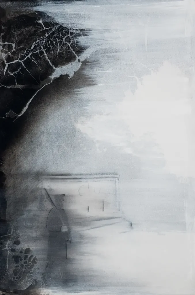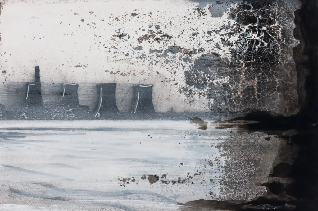 Cooling Towers, Carbon on Wood Panel, 20 x 30 x 2 inch, 2022