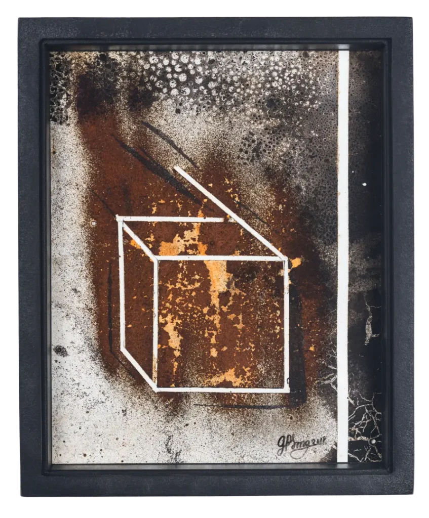 L7 Cubed, Iron Byproduct, Carbon and Sumi Ink on Photo Paper, 11 x 9 x 2 inch, 2018