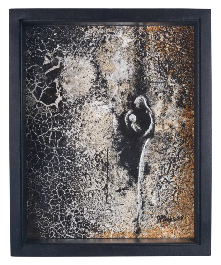 Madonna and Child, Iron Byproduct, Carbon and Sumi Ink on Photo Paper, 11 x 9 x 2 inch, 2018
