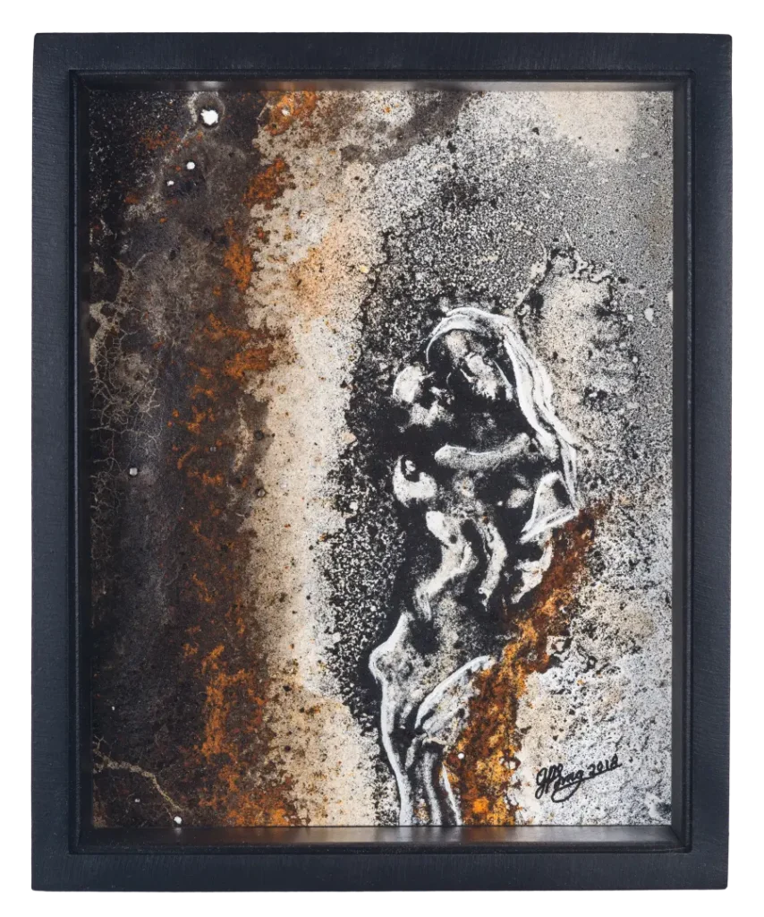 Madonna and Child 2, Iron Byproduct, Carbon and Sumi Ink on Photo Paper, 11 x 9 x 2 inch, 2018