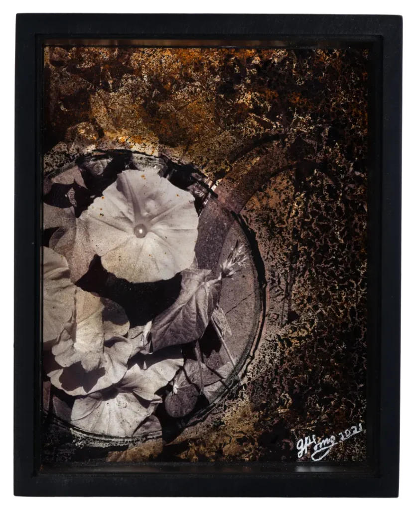 Morning Glory, Iron Byproduct, Carbon and Sumi Ink on Photo Paper, 11 x 9 x 2 inch, 2022