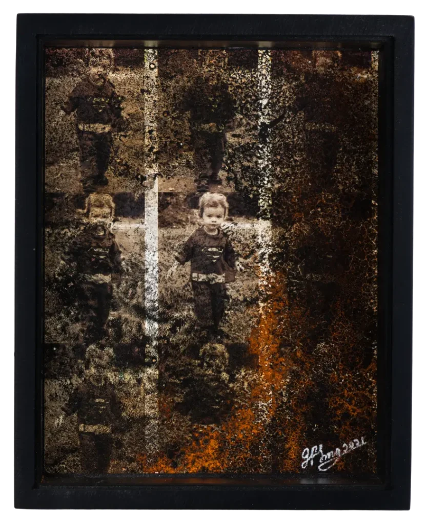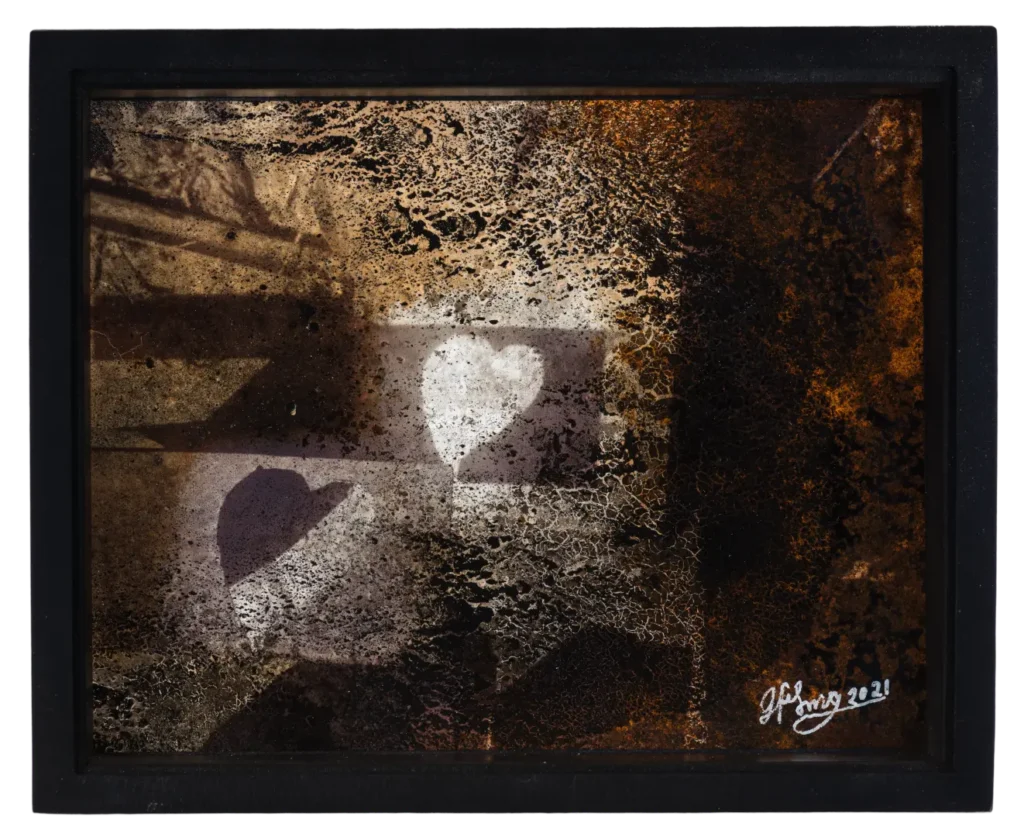 Valentine, Iron Byproduct, Carbon and Sumi Ink on Photo Paper, 9 x 11 x 2 inch, 2021