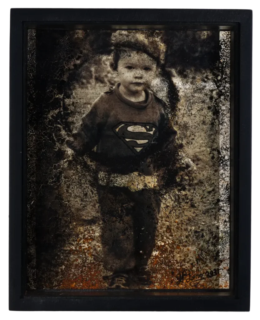Superman 2, Iron Byproduct, Carbon and Sumi Ink on Photo Paper, 11 x 9 x 2 inch, 2021